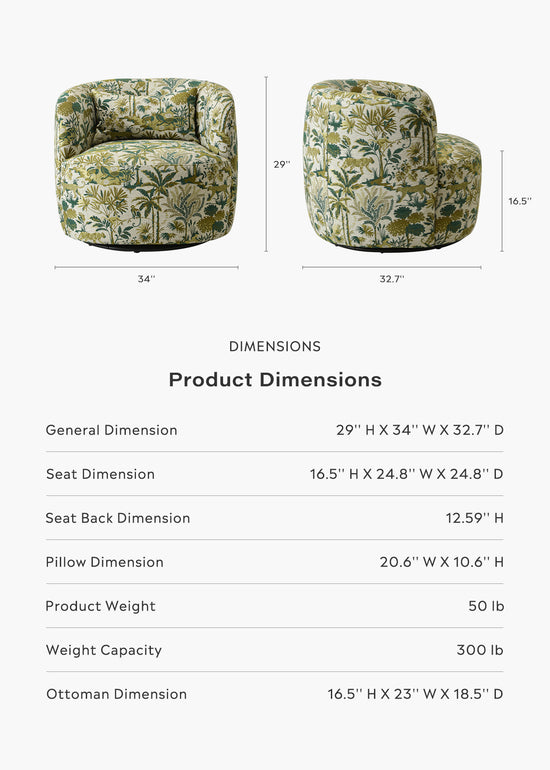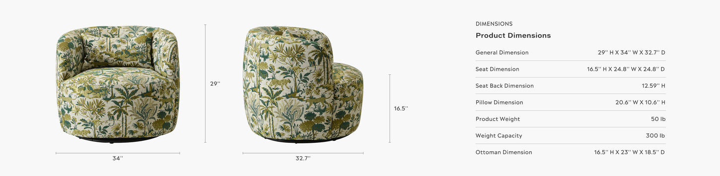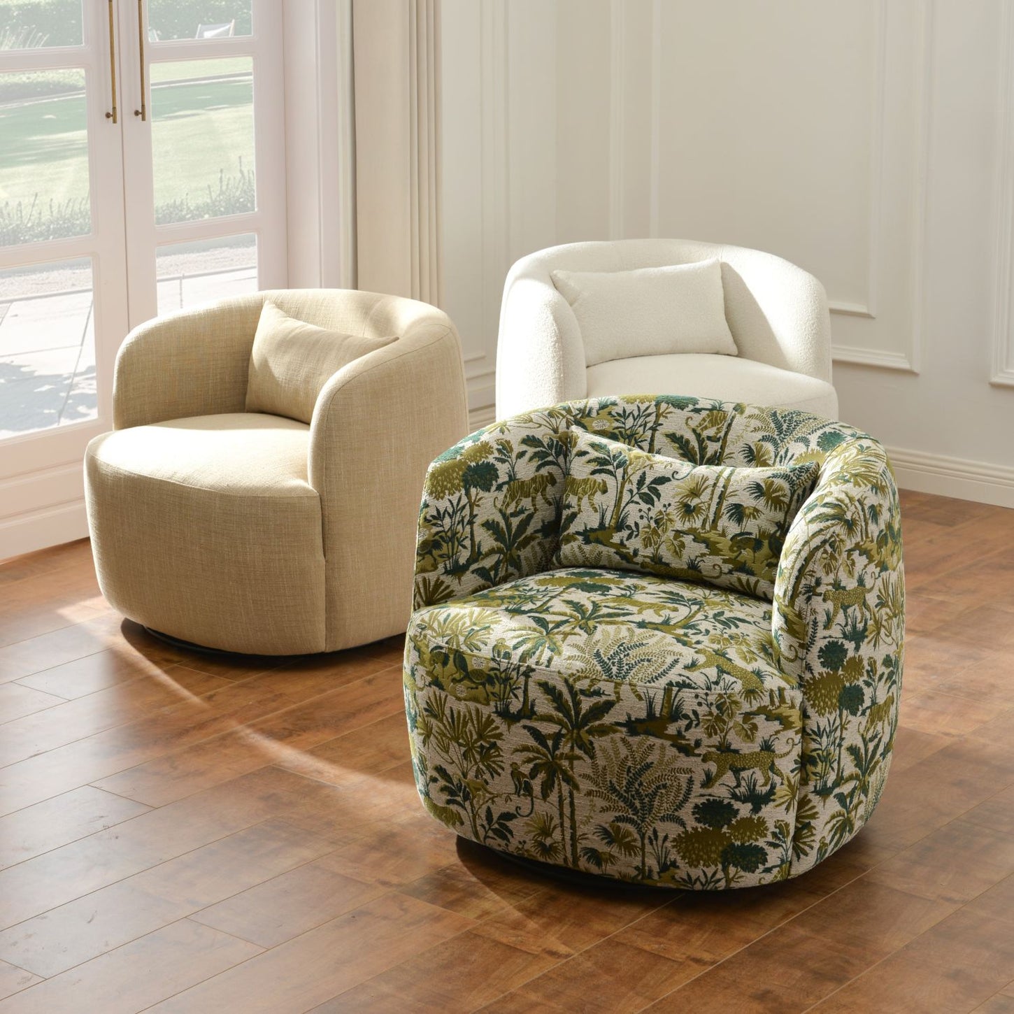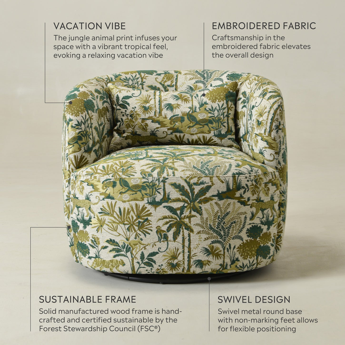 Showcasing a vibrant jungle animal print with intricate embroidery, this piece features curved arms and a 360° swivel base, making it a perfect addition to any space and evoking a relaxed vacation vibe. Exclusive to Kinwell.