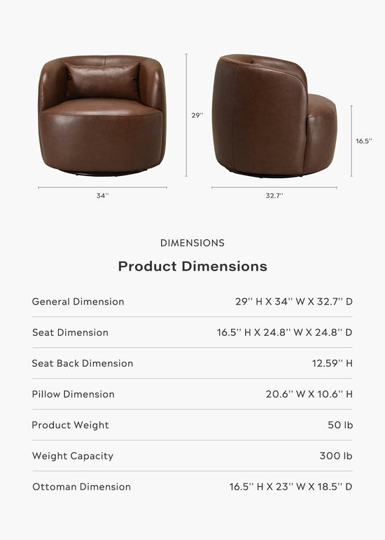 · Materials: Waterproof faux leather, kiln-dried pine wood, solid + manufactured wood, high density foam, iron swivel base