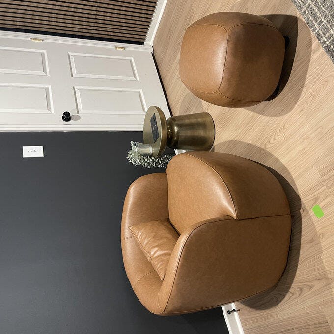 The Ashlie leather swivel chair seamlessly embodies the luxury of modern design. Its sumptuous genuine leather upholstery and gracefully curved shape elevate its overall allure.