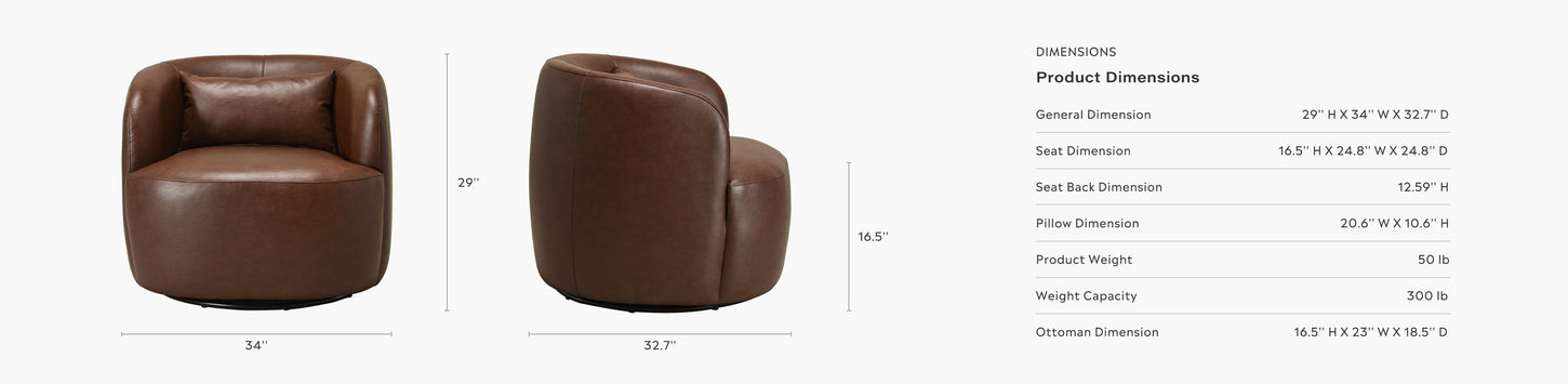 · Materials: Waterproof faux leather, kiln-dried pine wood, solid + manufactured wood, high density foam, iron swivel base