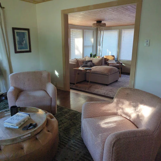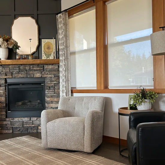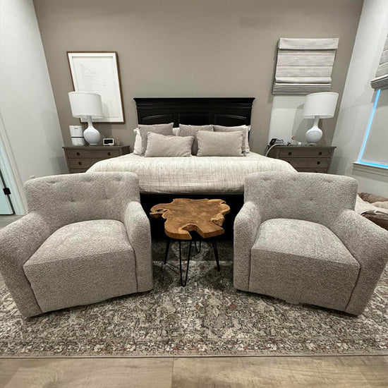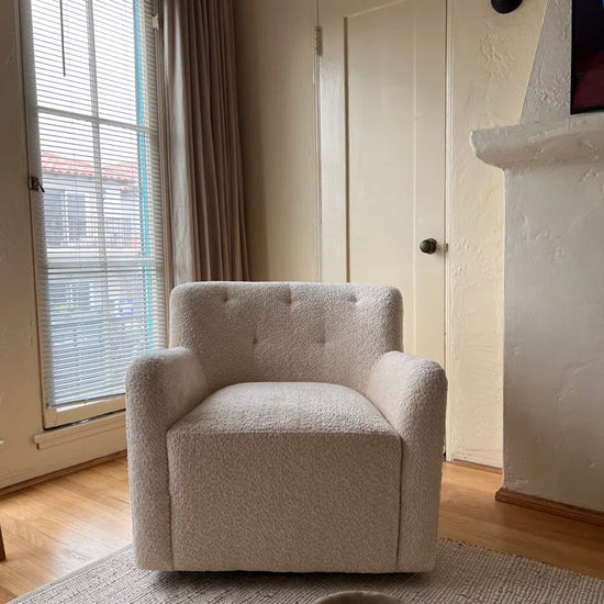 Enjoy the freedom to swivel 360 degrees, allowing you to effortlessly pivot and engage with your surroundings. The luxurious chenille fabric and elegant tufted back with button detailing exude both style and sophistication.