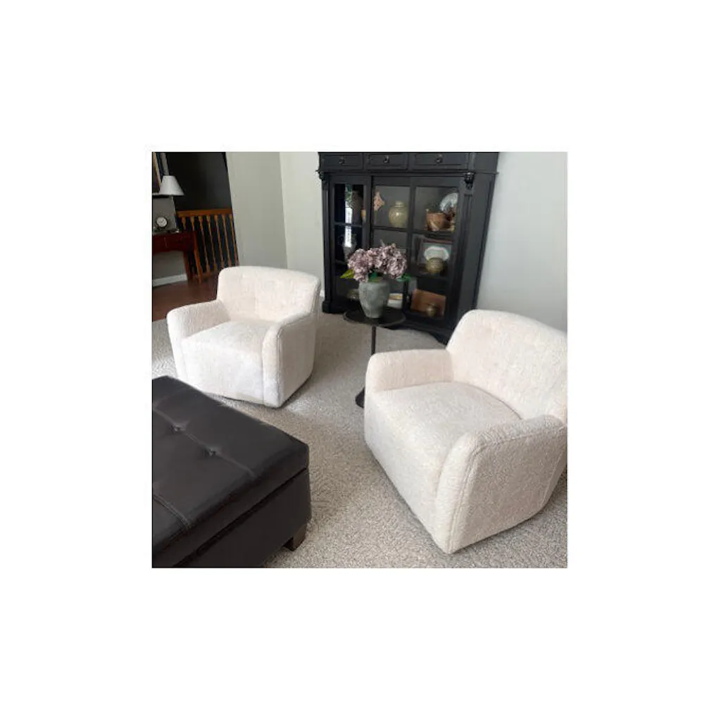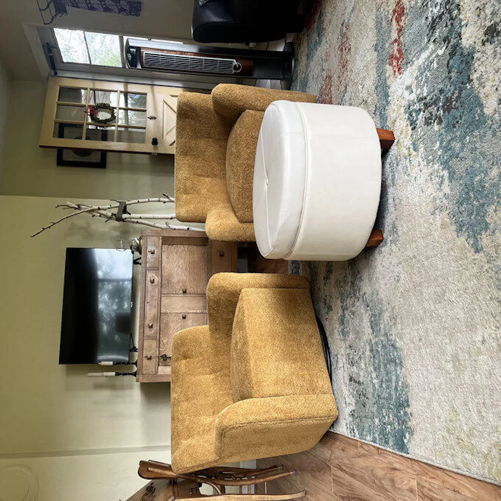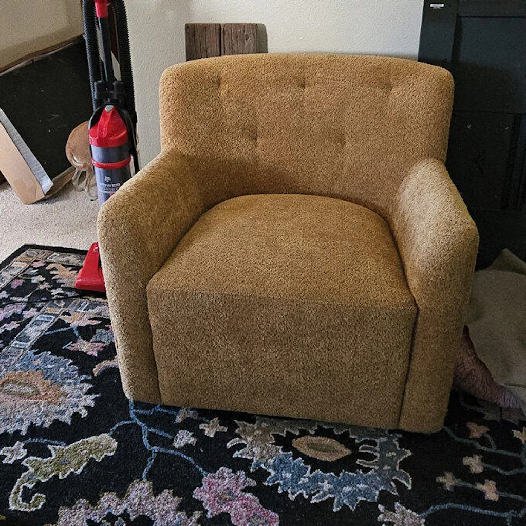 Enjoy the freedom to swivel 360 degrees, allowing you to effortlessly pivot and engage with your surroundings. The luxurious chenille fabric and elegant tufted back with button detailing exude both style and sophistication.